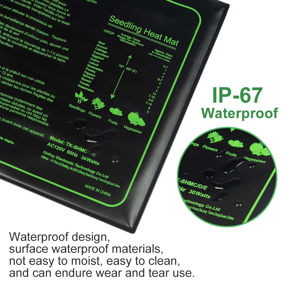 Die Saatmatte ist wasserdicht nach IP67 und die Oberfläche ist leicht zu reinigen, sodass Sie sie sicher schrubben können. Legen Sie das Heizkissen einfach flach unter die Anzuchtschalen, stecken Sie den Stecker in die Steckdose und schalten Sie das Gerät ein, um mit dem Heizen zu beginnen.