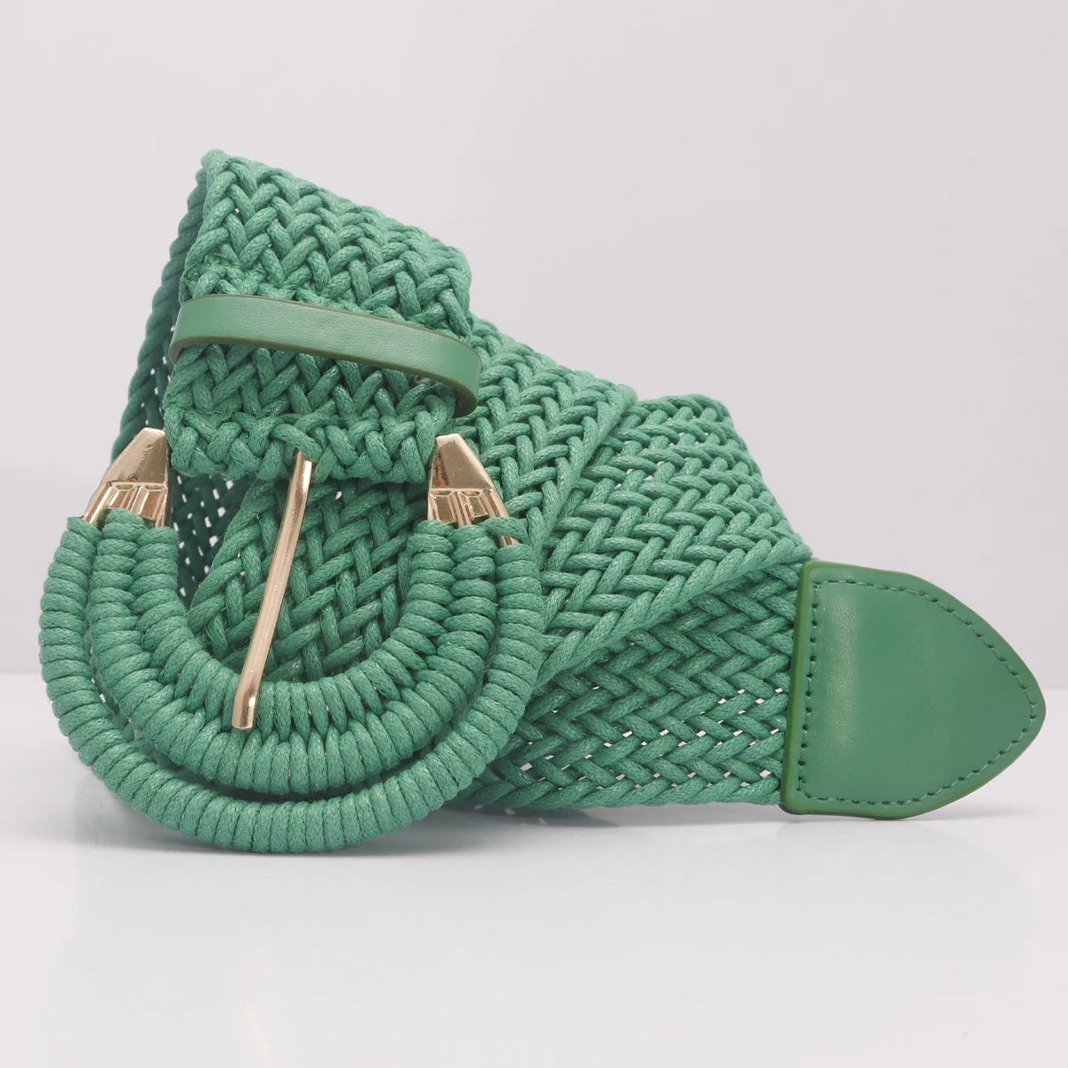 Green Woven Rattan Straw Waist Belt for Women Alloy Buckle Braided Belt for Dress
